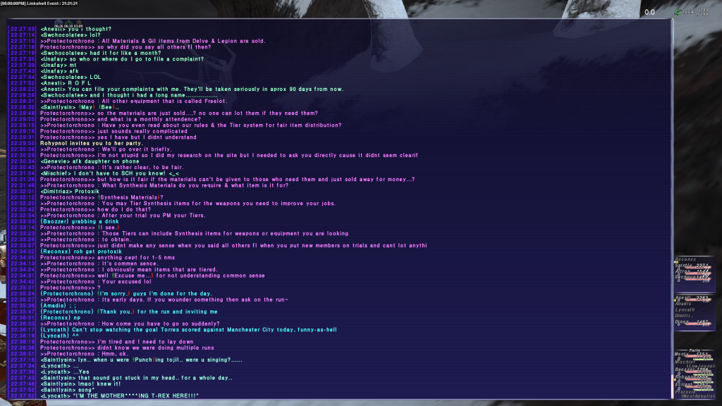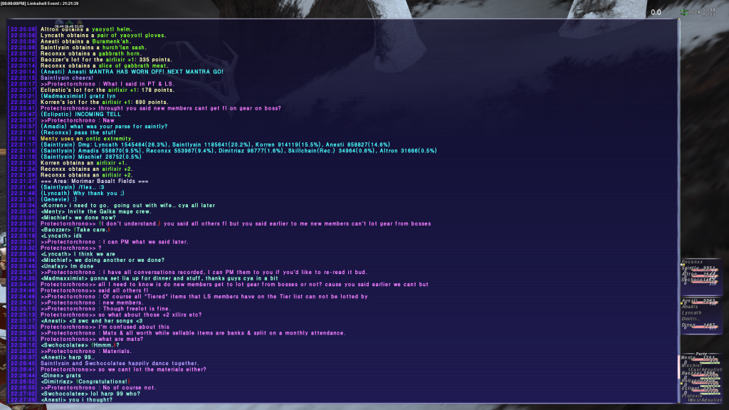 This guy, I swear when I met him I knew he would be trouble. In Enigma, we have a system where we farm for our ls members, whether it be gil or gear. On the weeks that we take outsiders in, we do it because we want everyone to have the win, but when we take others in with us, the ls loses out on bank which is our primary goal, to further our own members. So to make up this difference we charge, but aren't forcing anyone to pay us, if they pay it means they have the gil and are prepared to part with it in exchange for progressing through some of the more difficult aspects of the game. Players have done this since as long as I have played FFXI, and that's since 2004. Not to mention, Protectorchrono, he was worse than me, and that's saying a whole lot, the only week I saw him there he constantly screwed up and let it get to him to the point that all he was focused on was apologizing and not learning. If he isn't happy with the way we do things, then that's fine but he needs to lay off. Our ls. since the time I have been there, and before when I would watch Una play when I was on Rag server, you guys have always been a pretty upstanding group of peeps.